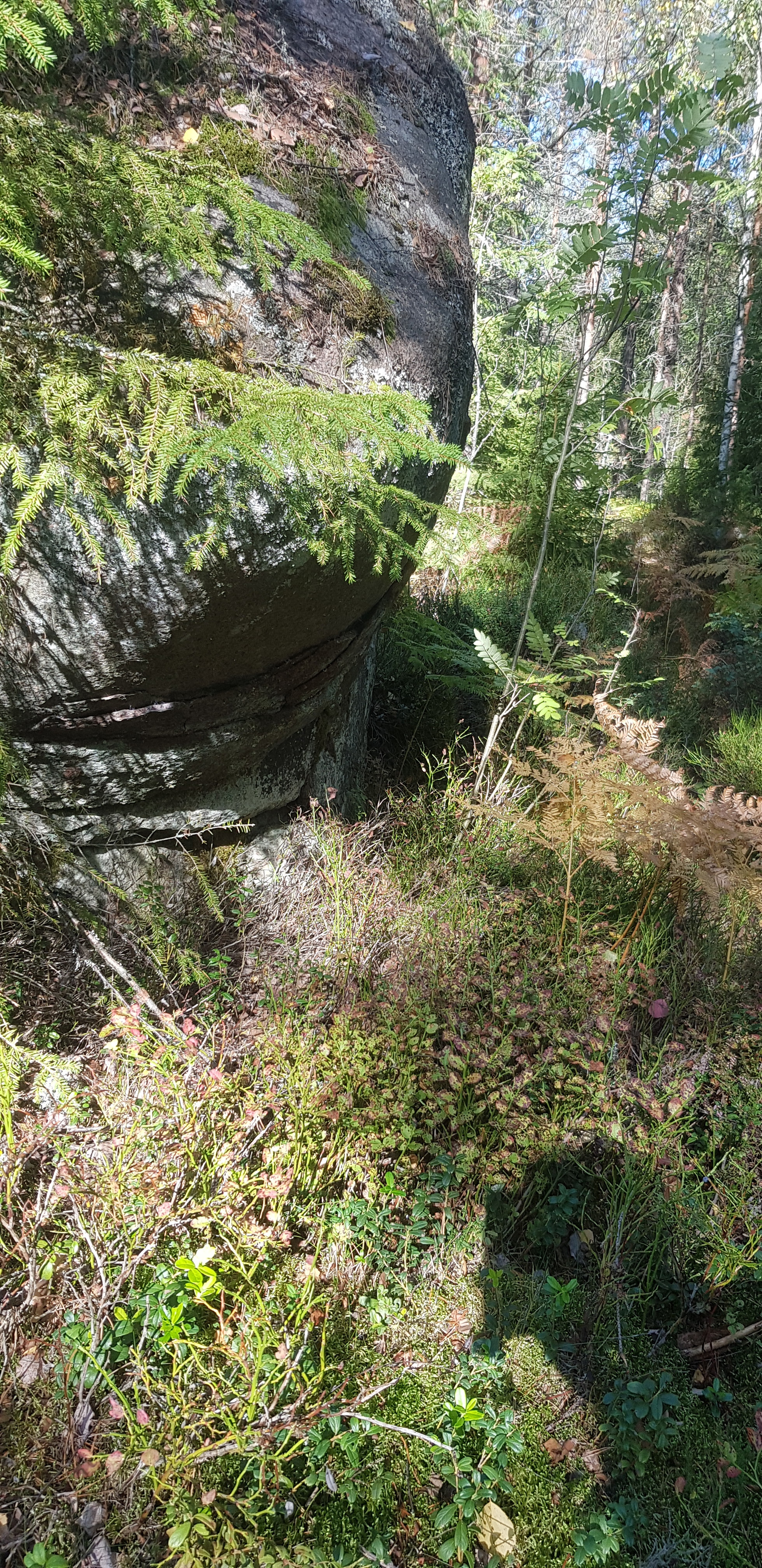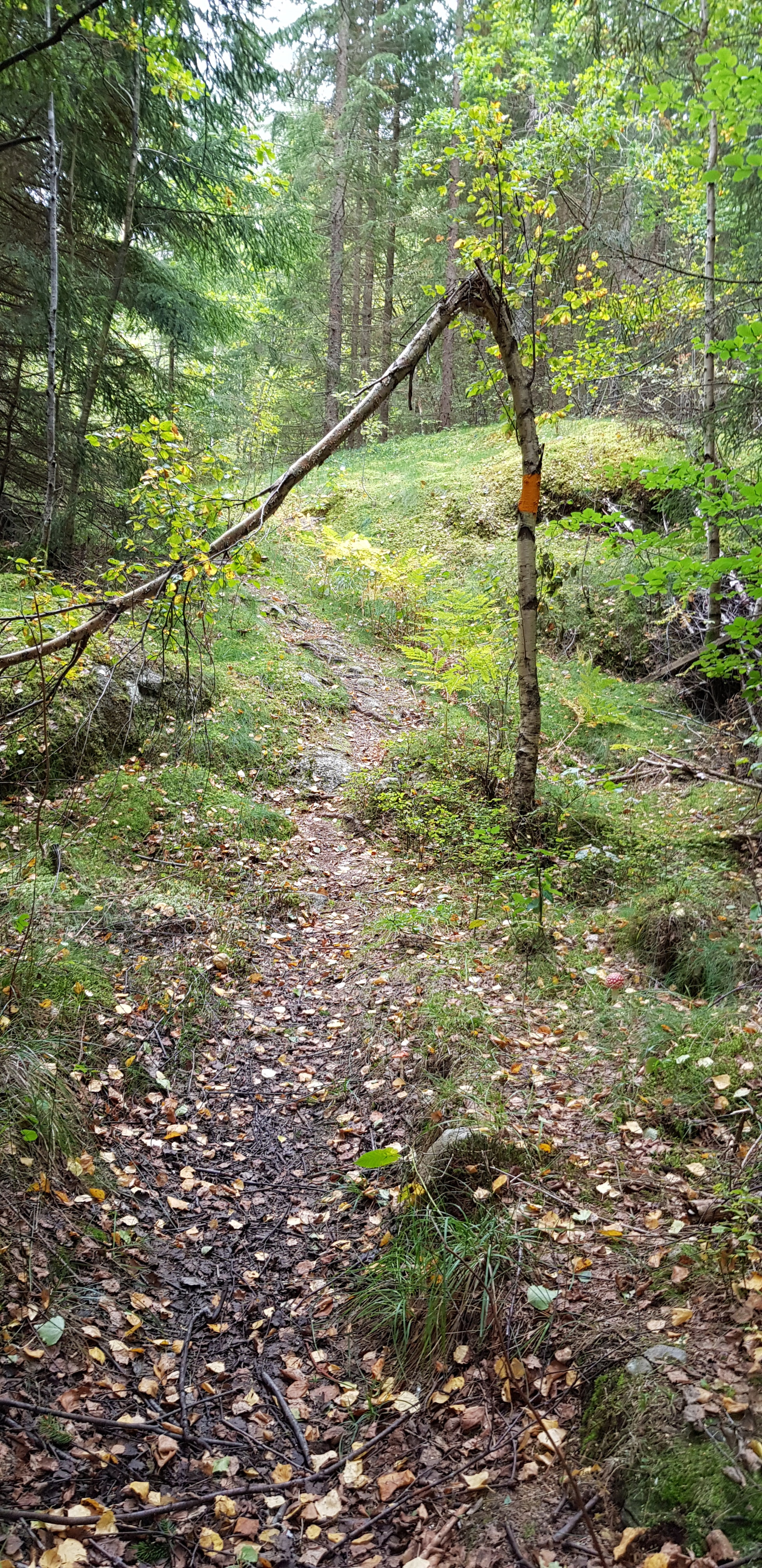 Stage 6 beginnt nördlich Hallingebergs Kirche in Källtorpets kleines Häuschen (Betreten Sie eine kleinere Route an den IOGT Räumlichkeiten). Der Weg verläuft in der Nähe des Archipels. Der Blick ist fein gegen die wunderschön gelegene Hallingeberg Kirche Leden und folgt dann einem alten Reitweg. Verpassen Sie nicht die netten Riesen südlich des Weges (Folgen Sie der Markierung). Der Weg rundet den beeindruckenden Bewegungsblock "The Bird Stone," der nach der Legende jedes Mal dreht, wenn die Kirchenglocken läuten. Auf dem Weg nach oben werden eine kalte Quelle und eine schwere Kiefer übergeben.