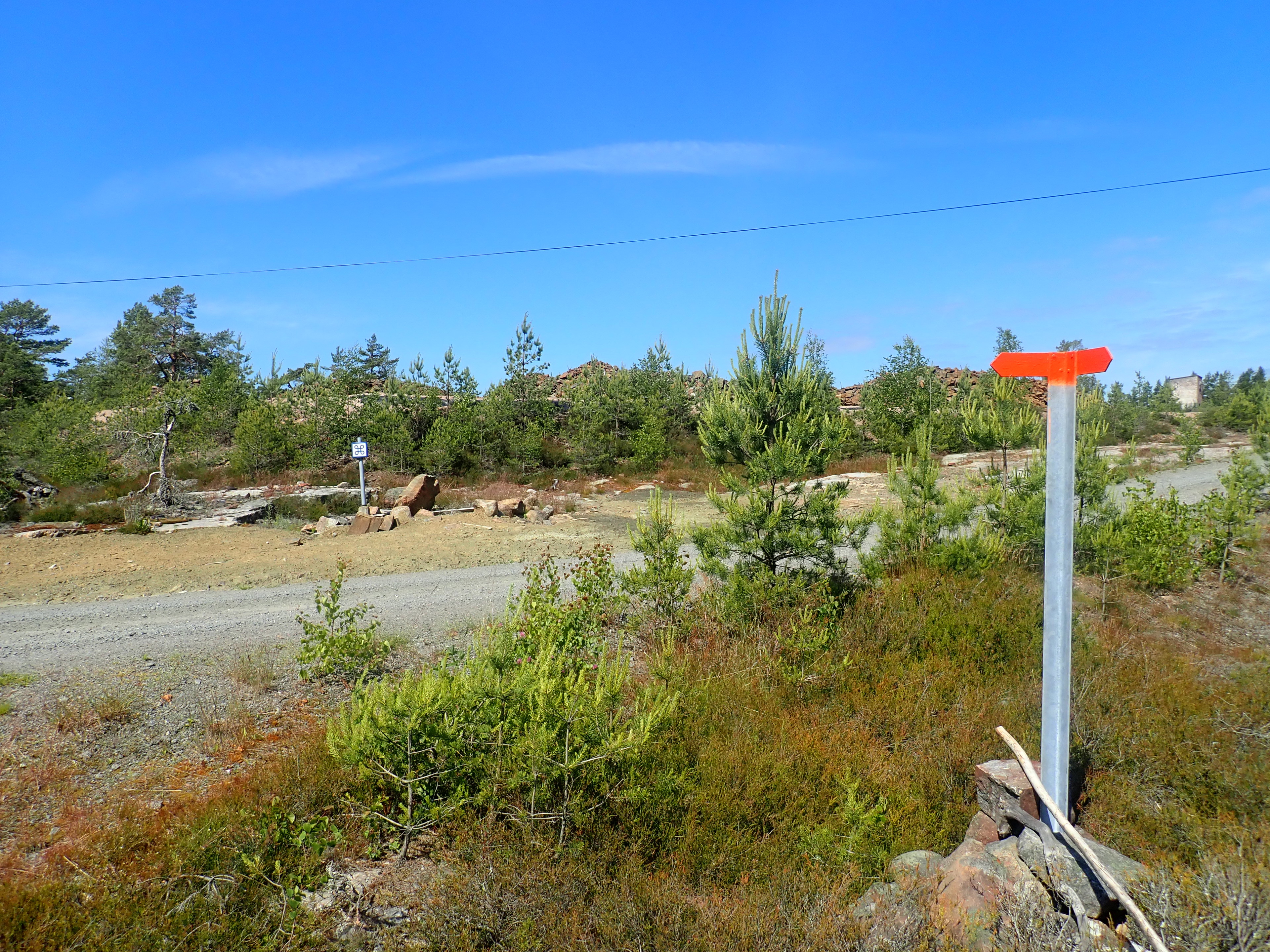 Utmärkning: Orange ringar runt trädstammar och på uppsatta pålar och pilar (enligt svensk standard)