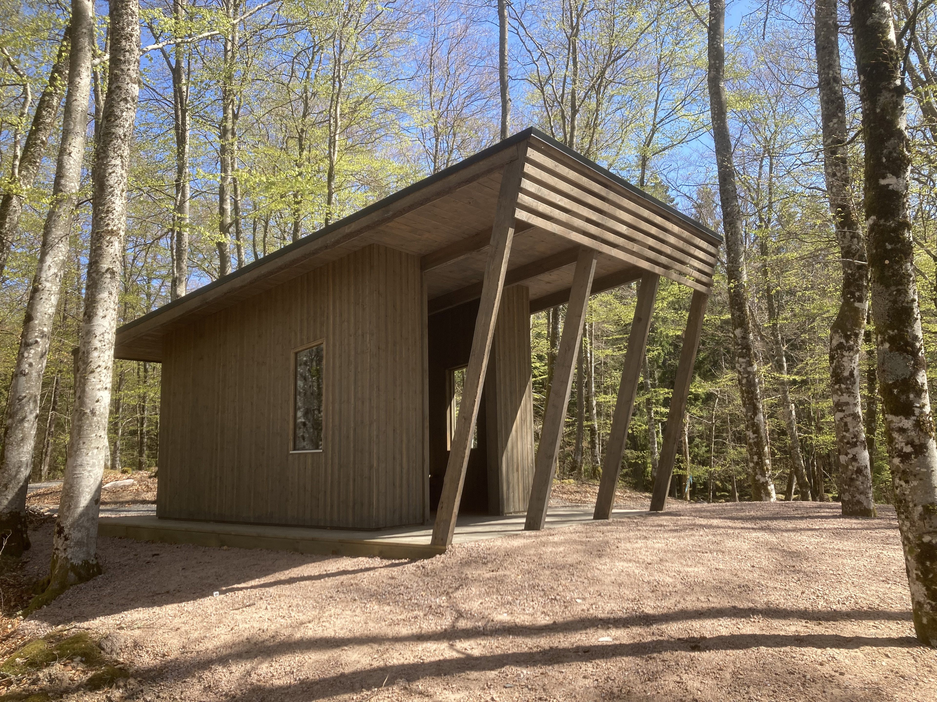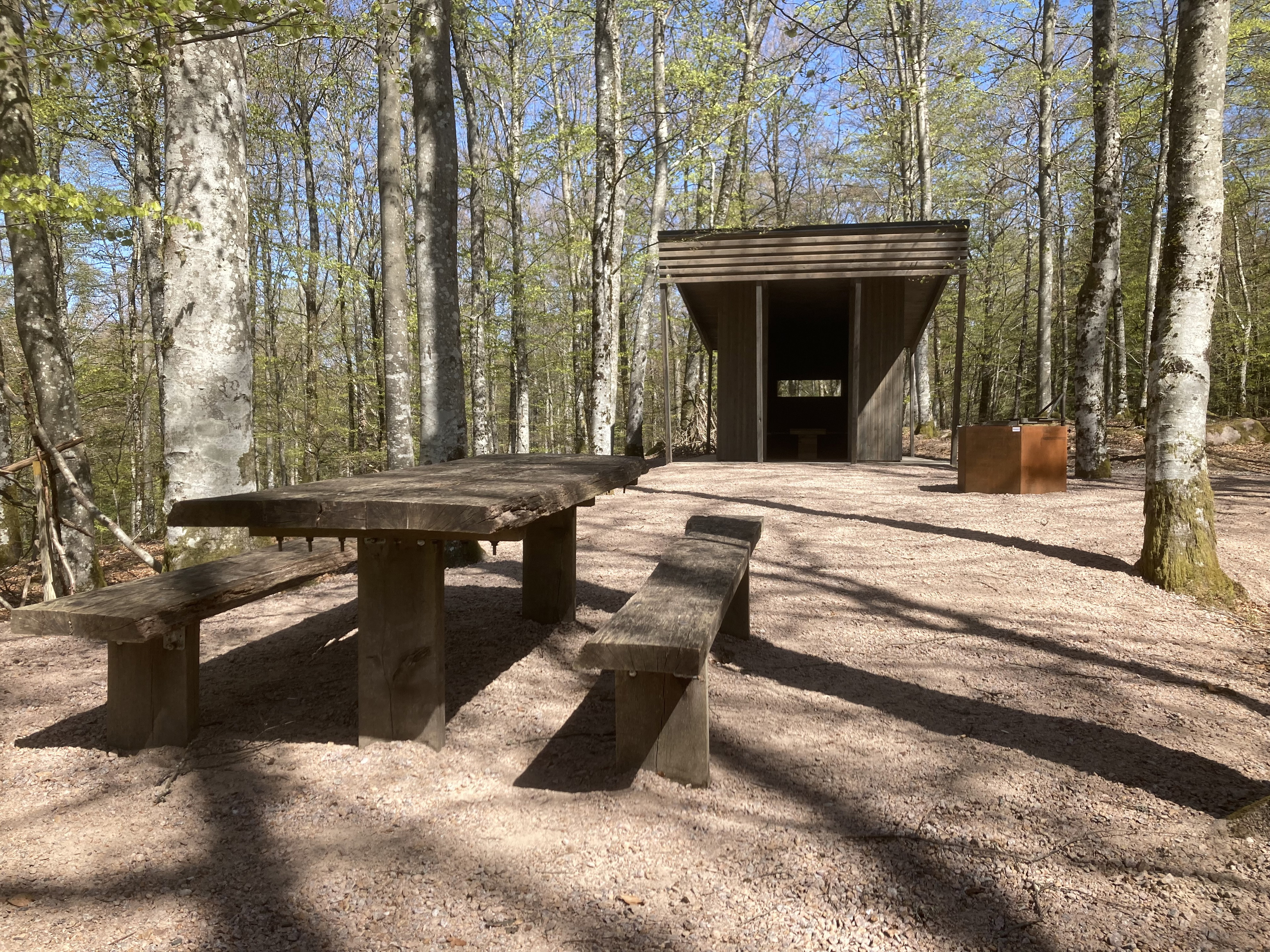 Här har du ett stort och rymligt vindskydd med bänkar och bord. Vindskyddet är byggt i unik stil som…