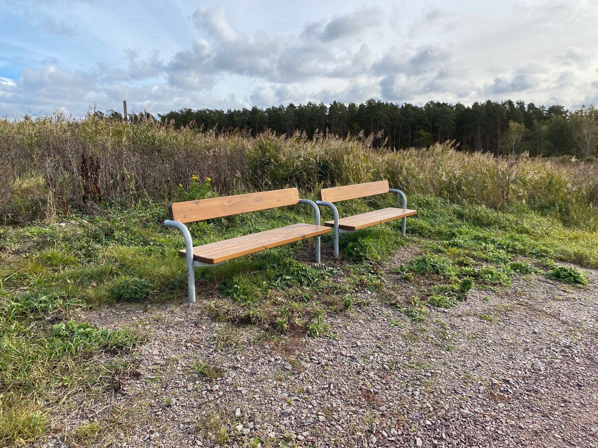 Grus och gräs. Grusväg uppför backen. Sittbänkar finns på vägen uppför backen.