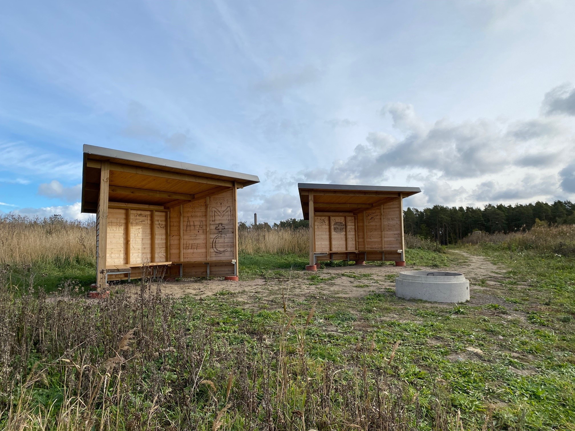 Även vid basen av kullen finns två likadana vindskydd, också de med tillhörande grill.